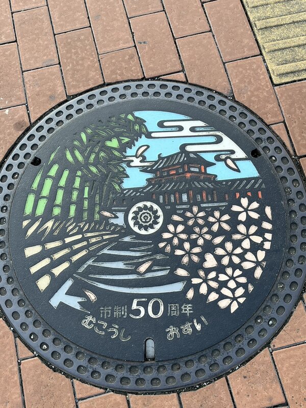 京都府向日市の市政施行50周年の記念としてデザインを公募して作成したもので、竹の径、桜並木の向こう側にかつての長岡宮を重ねあわせて自然と歴史の町をイメージしたものです。