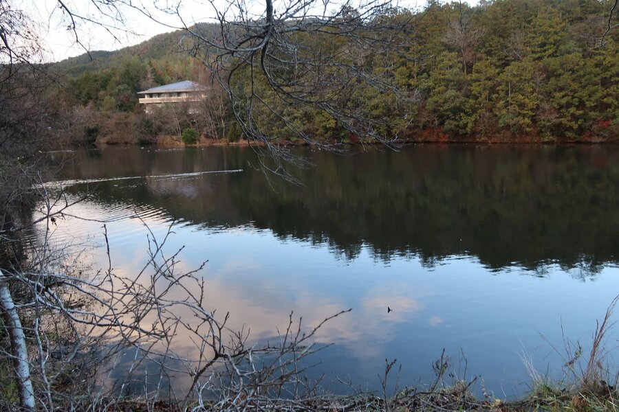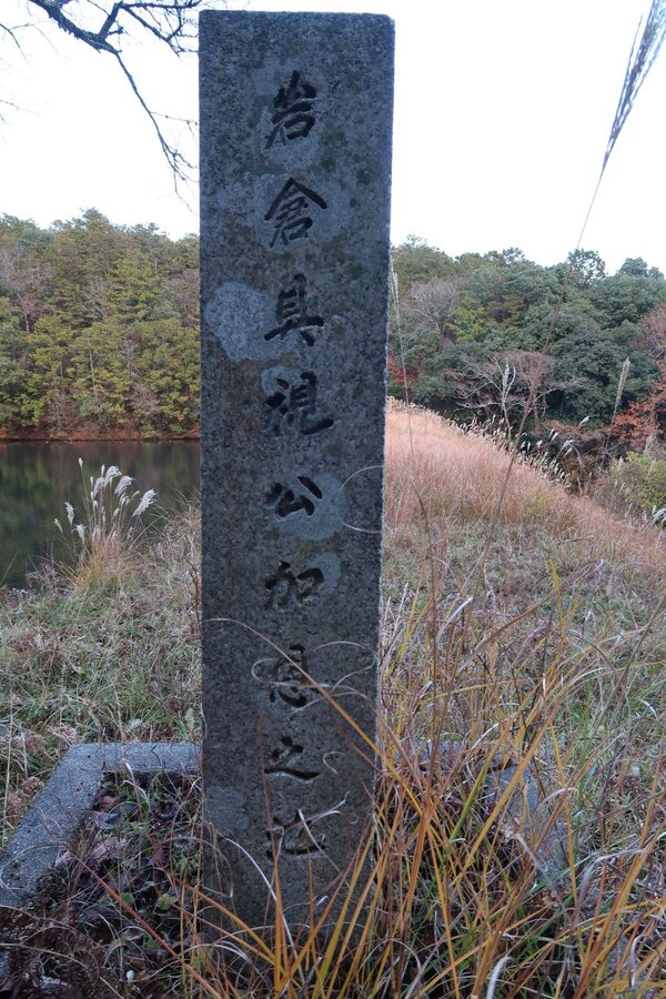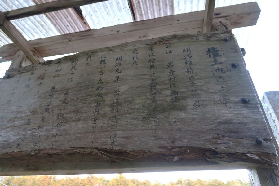 岩倉の実相院から北へ「熊出没」の看板を横目に山沿いの道を進むと、右手にフェンスに囲まれた権土池が現れる。明治の元勲・岩倉具視は村民の協力によりしばしば危害を免れ、そのお礼として参百円を寄付した。その資金を基にして村民が記念に造った農業用の溜め池(広さ6200㎡、最大水深約2.7m)である。