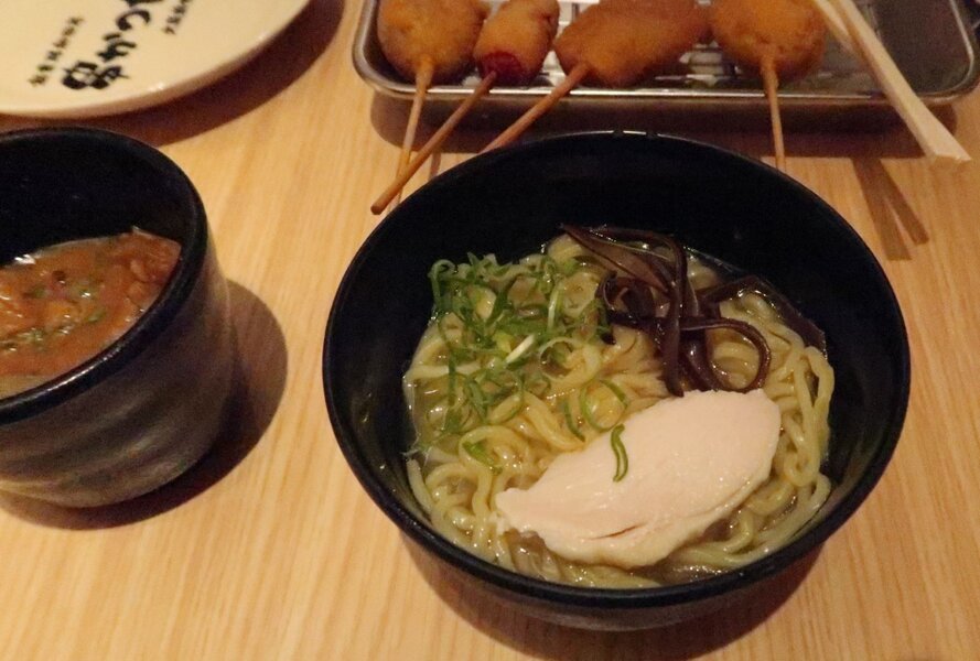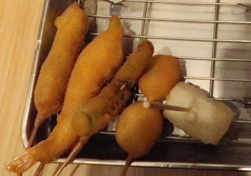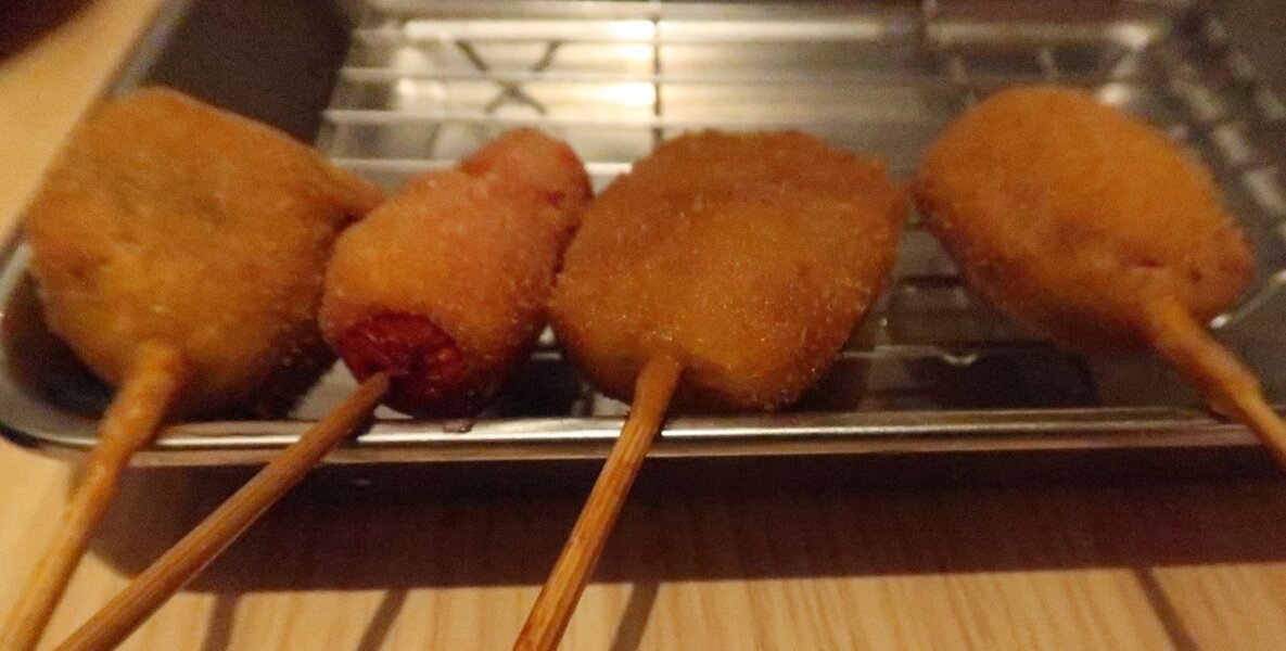 ・元祖串かつ     どて焼き(左)と鶏スープ麺(右) ・天然えび ・アスパラ ・うずら ・もち ・豚かつ ・つくね ・ウインナー ・チーズちくわ