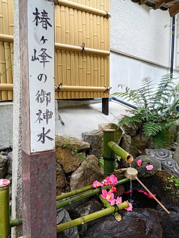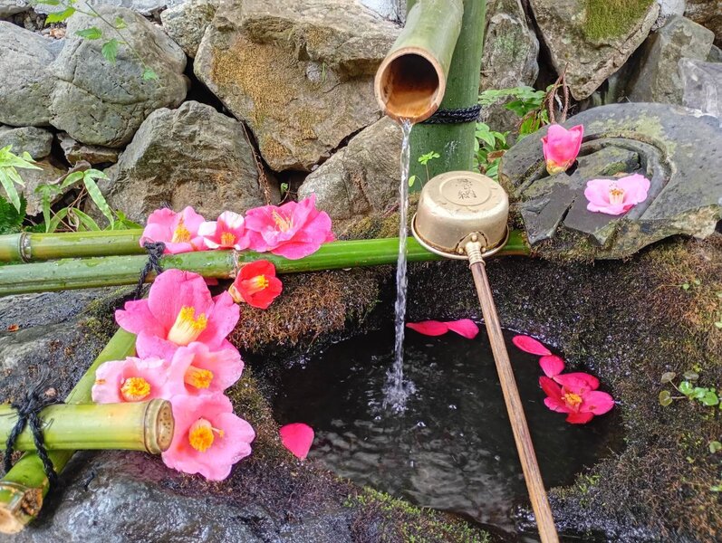 手水鉢に色鮮やかな花を浮かべて飾ることで、神社や寺院を訪れる人々の心を和ませる、おもてなしの文化です。ここではピンクと赤のツバキが使われており、冬から早春の訪れを感じさせます。